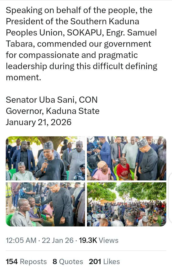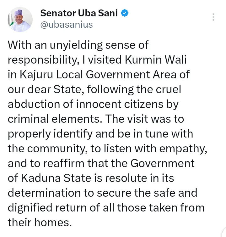 This is coming after VANGUARD reported that over 100 worshippers were kidnapped in the Kajuru Local Govenment Area of Kaduna state. The former Kaduna lawmaker reacted after Uba Sani announced that he has visited the LGA where the incident happened.