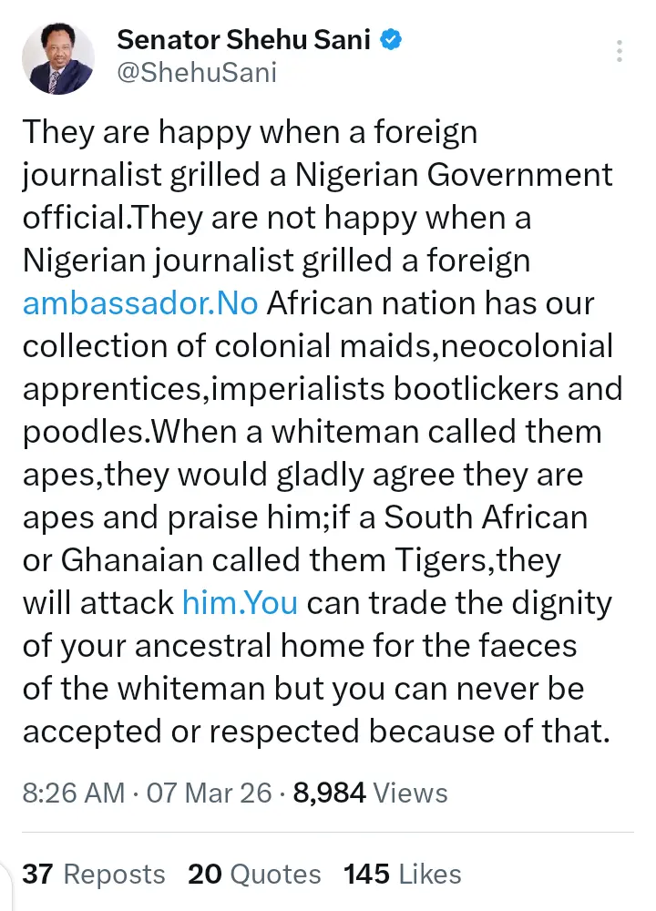 However, Shehu Sani has now shared his thoughts after the post surfaced online. In a statement that he shared on his official X handle, he said people are always happy when a foreign journalist grills a Nigerian official but gets angry when a Nigerian journalist grills a foreign ambassador.