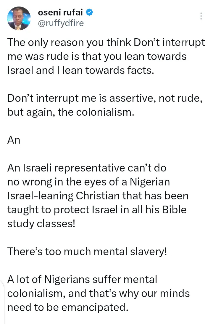 One of the chieftains of the All Progressive Congress, APC and former Kaduna lawmaker, Senator Shehu Sani has reacted after Arise TV broadcaster, Rufai Oseni was criticized for telling an Israeli ambassador not to interrupt him.