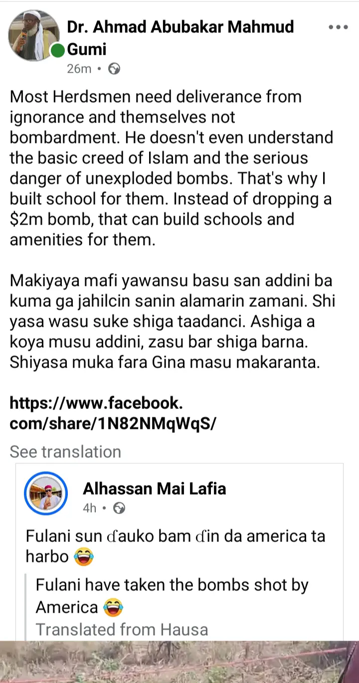 Sheikh Ahmad Gumi, a popular Islamic cleric and erstwhile military captain recently reacted after several Miyetti Allah cattle rearers were captured inspecting a remnant of an explosive from the United States military airstrikes. According to the statements which were shared on his official Facebook handle, he pointed out that they do not understand the dangers of explosives and that was why he built schools for them.