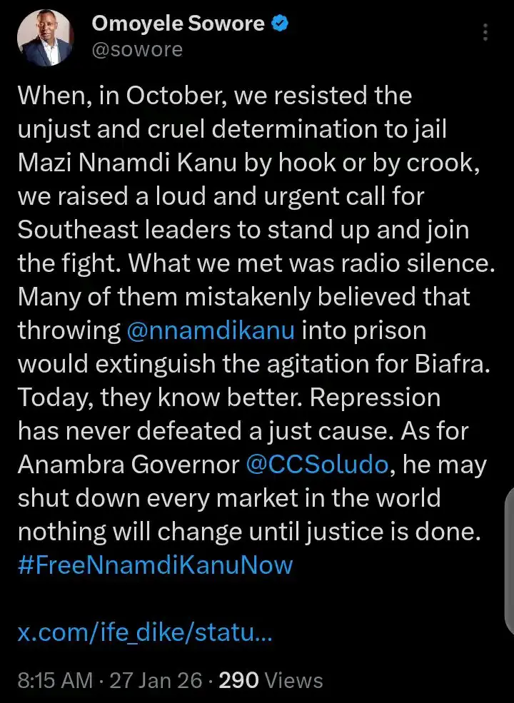 Sowore made this known in a post on his verified X (formerly Twitter) account on Tuesday, January 27, 2026. His comments followed the decision by the Anambra State Governor, Professor Charles Soludo, to temporarily close the Onitsha Main Market.