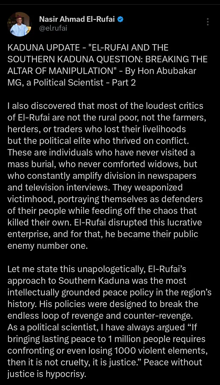 The former governor of Kaduna State and Chieftain of the ADC coalition, Mallam Nasiru El-Rufai has slammed his critics over his controversial actions in Southern Kaduna while serving as governor. According to his statements which were shared on his official X handle, he pointed out that his loudest critics were not the rural poor or farmers, but political elites who were bent on instigating conflicts.