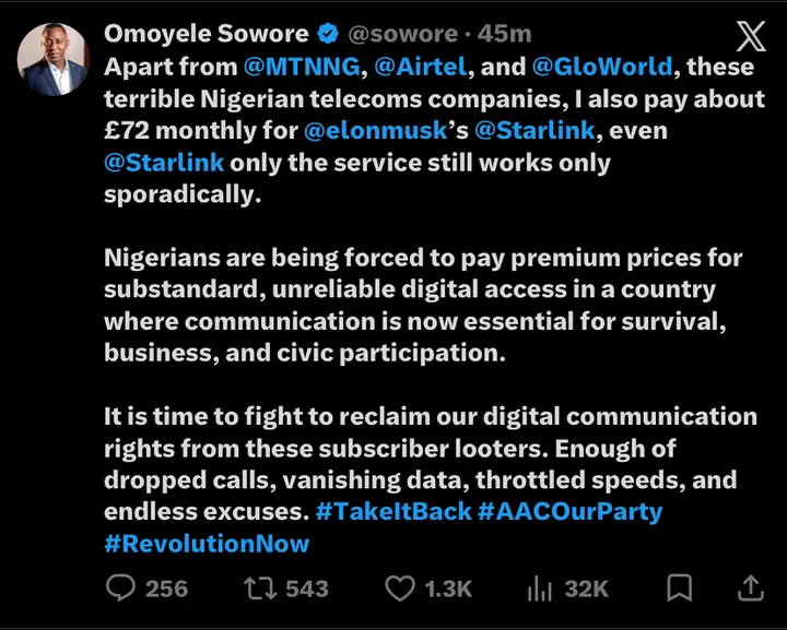 Sowore specifically named MTN Nigeria, Airtel, and Globacom (Glo), alongside Elon Musk’s Starlink satellite service, as culprits. “Apart from @MTNNG, @Airtel, and @GloWorld, these terrible Nigerian telecoms companies, I also pay about £72 monthly for @elonmusk’s @Starlink, even @Starlink only the service still works only sporadically,” he stated.