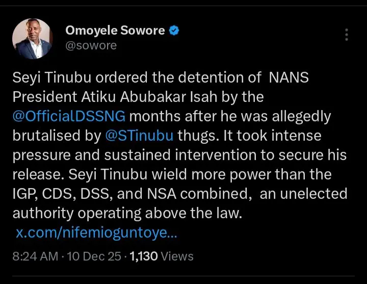 In response, Sowore highlighted on X that Seyi Tinubu wields significant influence, arguably surpassing the authority of many elected officials. The human rights activist noted that Seyi had previously ordered the detention of NANS President Atiku Abubakar Isah, underscoring the level of power he commands, sometimes exceeding that of formal security agencies.