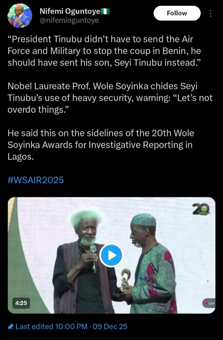 Omoyele Sowore, the prominent human rights lawyer and former presidential candidate, took to his official X account to comment on remarks made by Nobel laureate Professor Wole Soyinka regarding President Tinubu’s son, Seyi Tinubu. Soyinka had suggested that, given the extensive security detail around Seyi, the president might have relied on his son rather than the armed forces to handle the coup in Benin Republic.