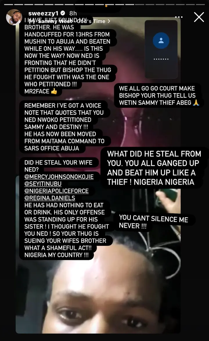 He wrote; “I HAVE JUST FOUND MY BROTHER. HE WAS HANDCUFFED FOR 13HRS FROM MUSHIN TO ABUJA AND BEATEN WHILE ON HIS WAY…. IS THIS NOW THE WAY? NOW NED IS FRONTING THAT HE DIDN’T PETITION BUT BISHOP THE THUG HE FOUGHT WITH WAS THE ONE WHO PETITIONED MR2FACE. REMEMBER I’VE GOT A VOICE NOTE THAT QUOTES THAT YOU NED NWOKO PETITIONED SAMMY AND DESTINY !!! HE HAS NOW BEEN MOVED FROM MAITAMA COMMAND TO SARS OFFICE ABUJA. DID HE STEAL YOUR WIFE NED? HE HAS HAD NOTHING TO EAT OR DRINK. HIS ONLY OFFENSE WAS STANDING UP FOR HIS SISTER ! | THOUGHT HE FOUGHT YOU NED ! SO YOUR THUG IS SUEING YOUR WIFES BROTHER WHAT A SHAMEFUL ACT!!“