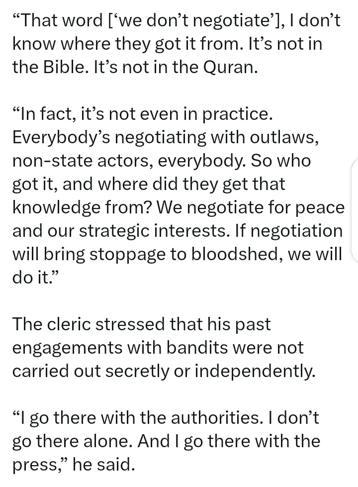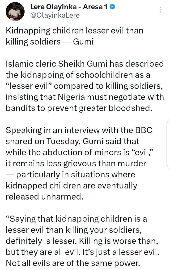 In the post that surfaced online, Sheikh Gumi stated that Kidnapping is a lesser evil than killing soldiers. He said it is not in the Bible or Quran that people should not negotiate with bandits.