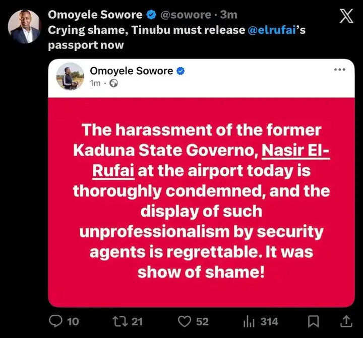 Shortly after the incident gained public attention, Sowore stated his stance in a tweet on his official social media account. “Crying shame, Tinubu must release @elrufai’s passport now,” he said in a short statement.