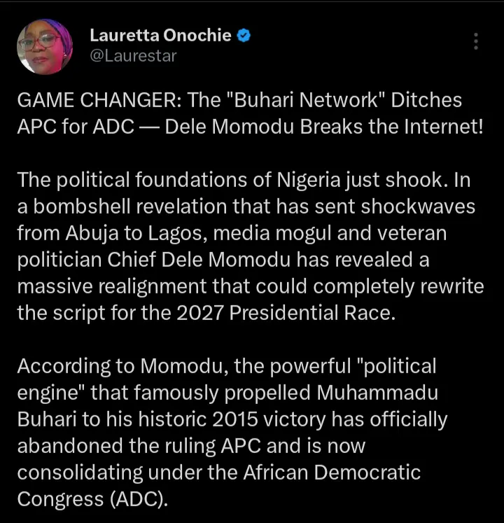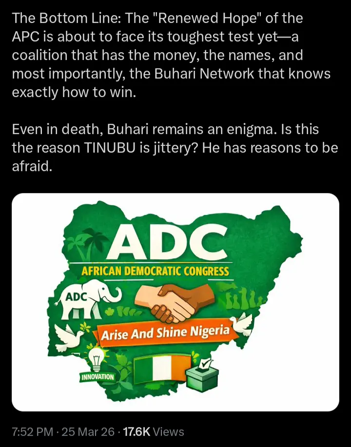 According to the statements which were shared on her official X handle, she pointed out that the APC, once a powerhouse, has been relegated to the shadows as former president Muhammadu Buhari’s network had aligned with the ADC.