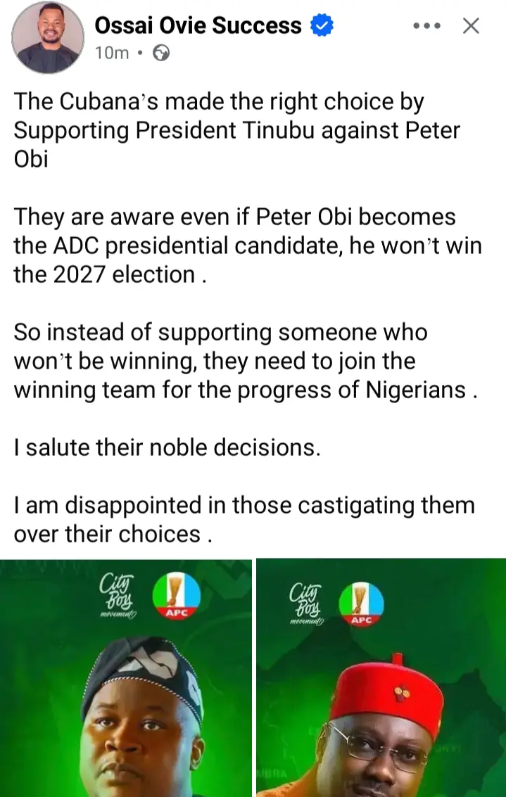 He wrote, “The Cubana’s made the right choice by Supporting President Tinubu against Peter Obi. They are aware even if Peter Obi becomes the ADC presidential candidate, he won’t win the 2027 election. I am disappointed in those castigating them over their choices.”