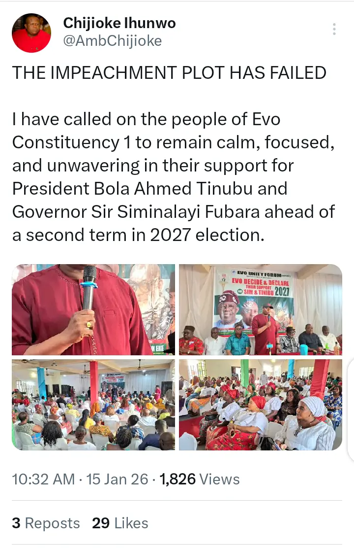 “The impeachment plot has failed. I have called on the people of Evo Constituency 1 to remain calm, focused and unwavering in their support for President Bola Ahmed Tinubu and Governor Sir Siminalayi Fubara ahead of a second term in 2027 election”.
