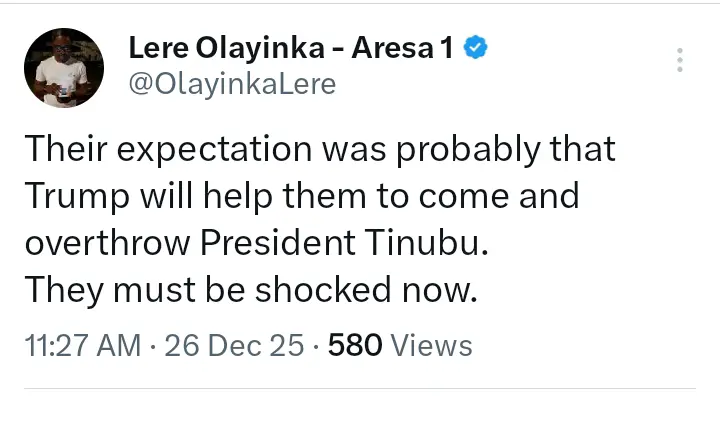 Olayinka stated that their expectation was probably that Trump would help them come and overthrow Tinubu, adding that such people must now be shocked by the outcome.