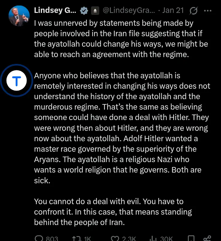 U.S. Senator Lindsey Graham has delivered a forceful condemnation of Iran’s ruling clerical establishment, warning against any renewed push to negotiate with Tehran as nationwide protests begin to subside.
