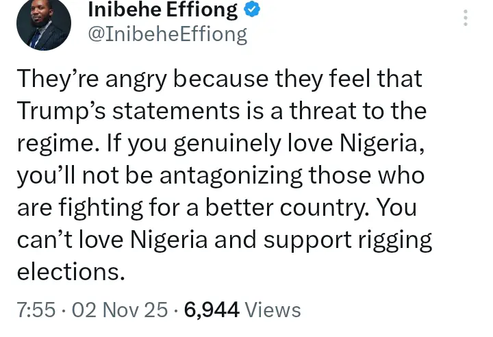 In a social media post, Effiong asserted that the widespread anger towards critics stems from the feeling that President Donald Trump’s recent statements endanger the stability of the current Nigerian “regime.”