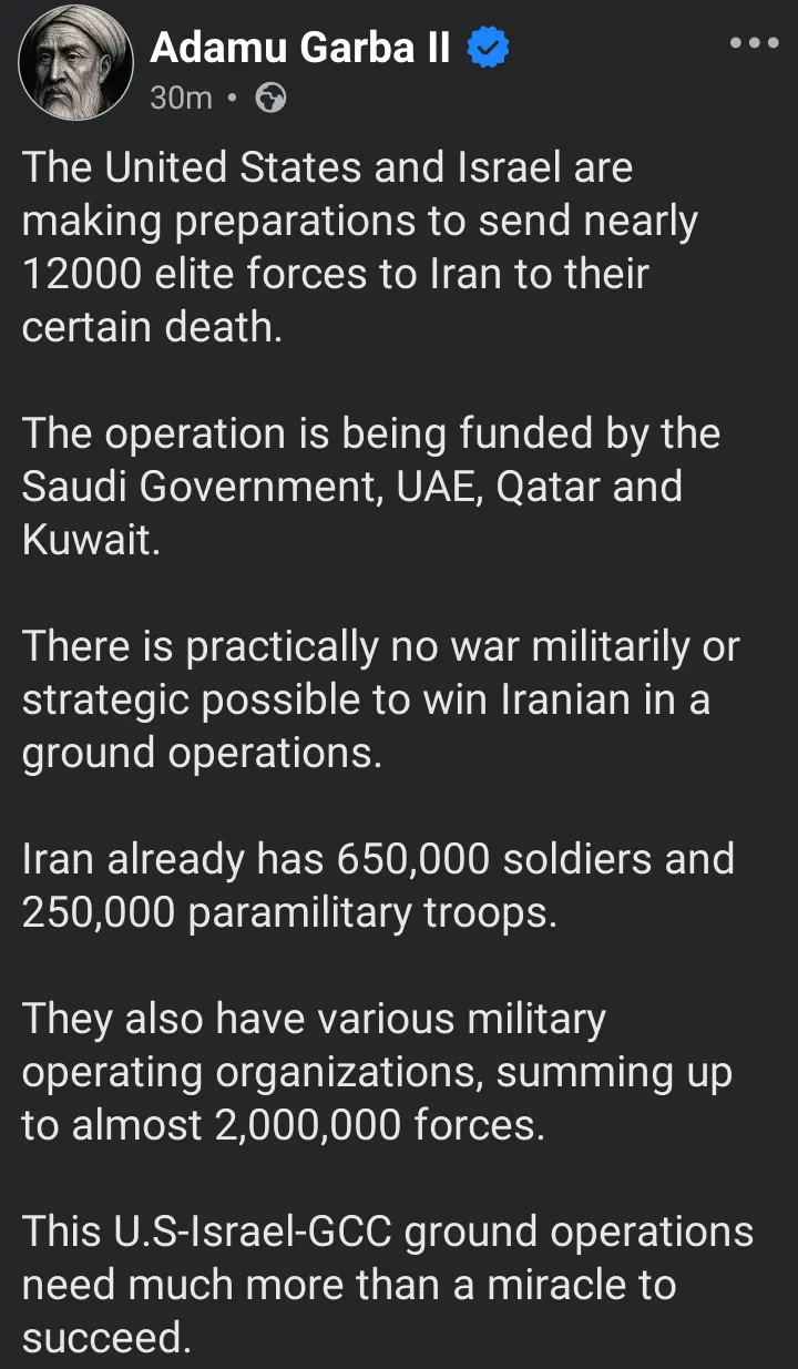 In a statement shared on his verified social media account, Garba claimed that Washington and Tel Aviv are preparing to deploy nearly 12,000 elite troops into Iran, describing the alleged move as a “suicidal mission” with little chance of success.
