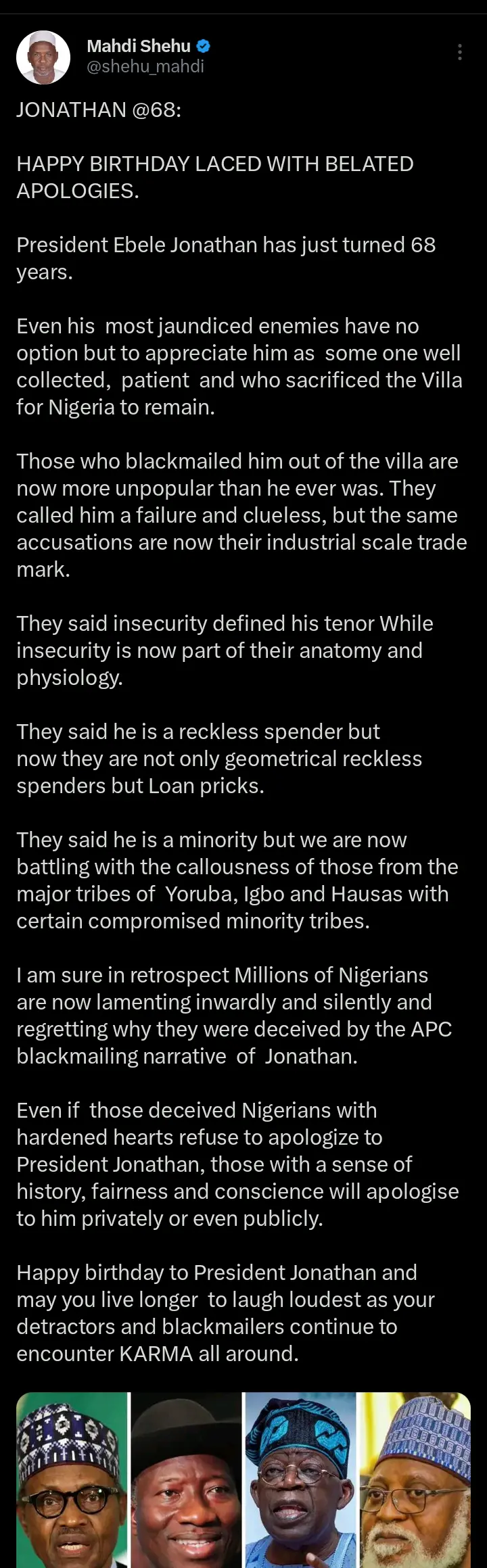 In a recent statement via his official X account, public affairs commentator, Mahdi Shehu, has sent warm wishes to former President Goodluck Ebele Jonathan, who recently marked his 68th birthday.