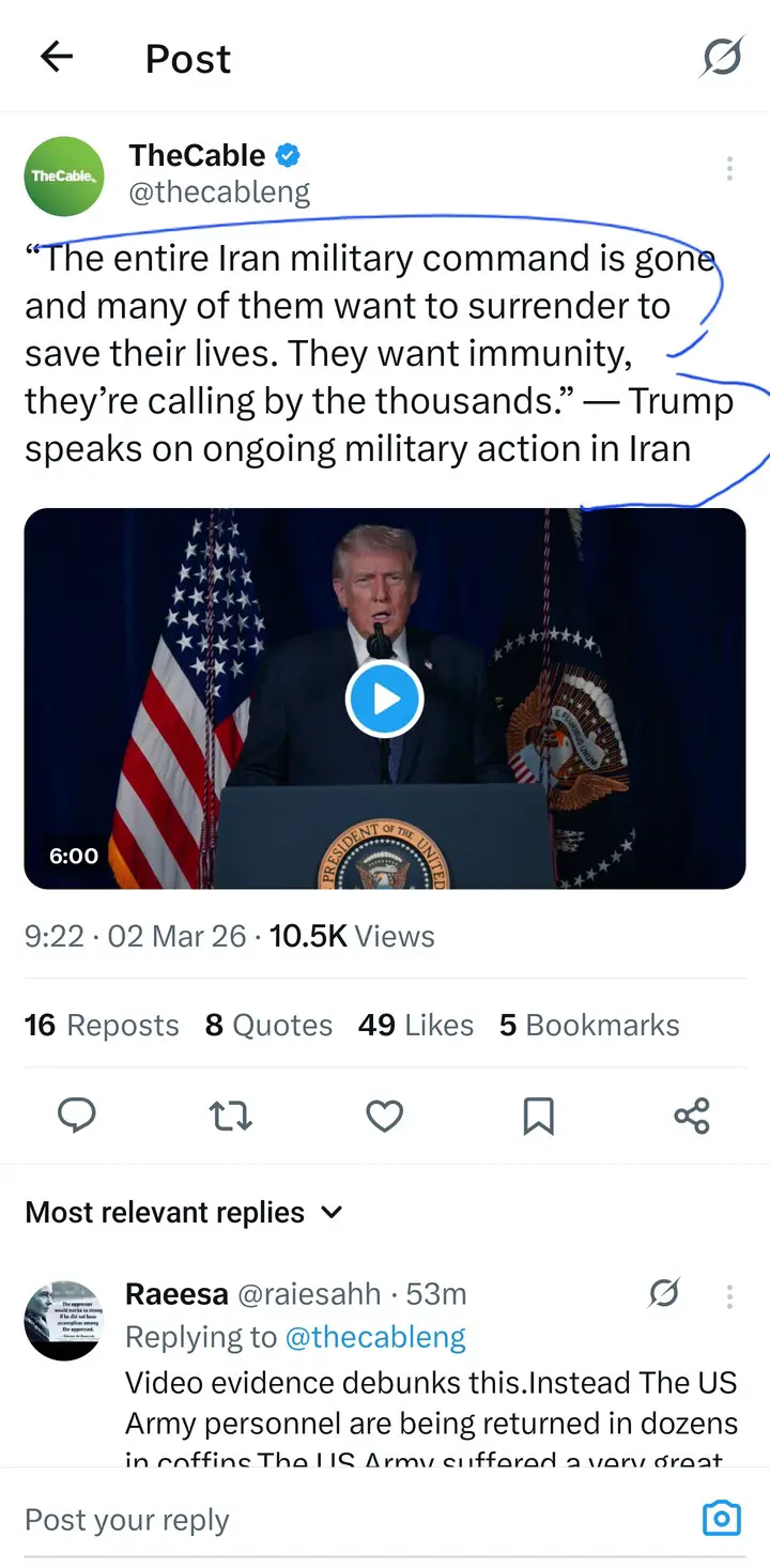 The president also said that many Iranian troops are attempting to surrender to save their lives. According to him, thousands are reaching out and requesting complete immunity from prosecution. He portrayed the wave of surrender requests as a sign that morale within Iran’s armed forces is rapidly deteriorating, adding that the combined impact of sustained attacks and promises of clemency is speeding up the breakdown of organized resistance.