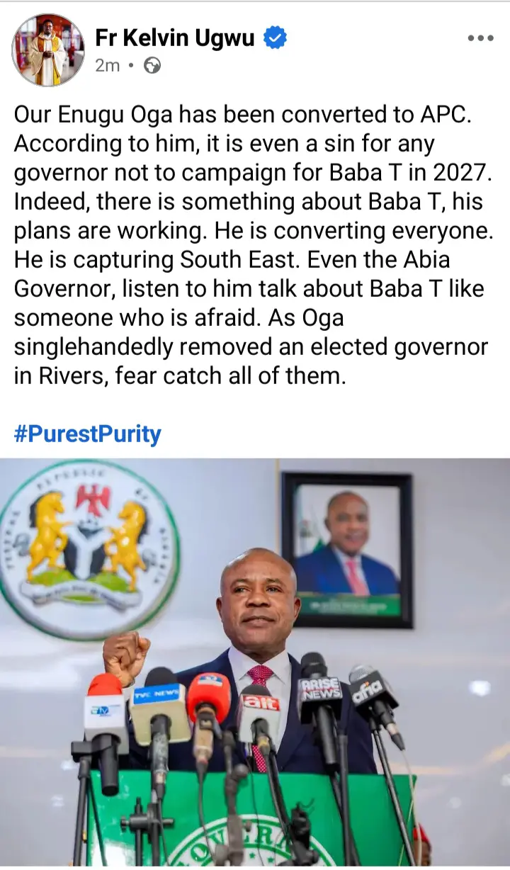 In a Facebook post on 14th October 2025, Fr. Kelvin stated that following his defection, Governor Mbah had strongly asserted that it would be a grave mistake for any state leader not to support President Bola Tinubu’s potential 2027 presidential bid.