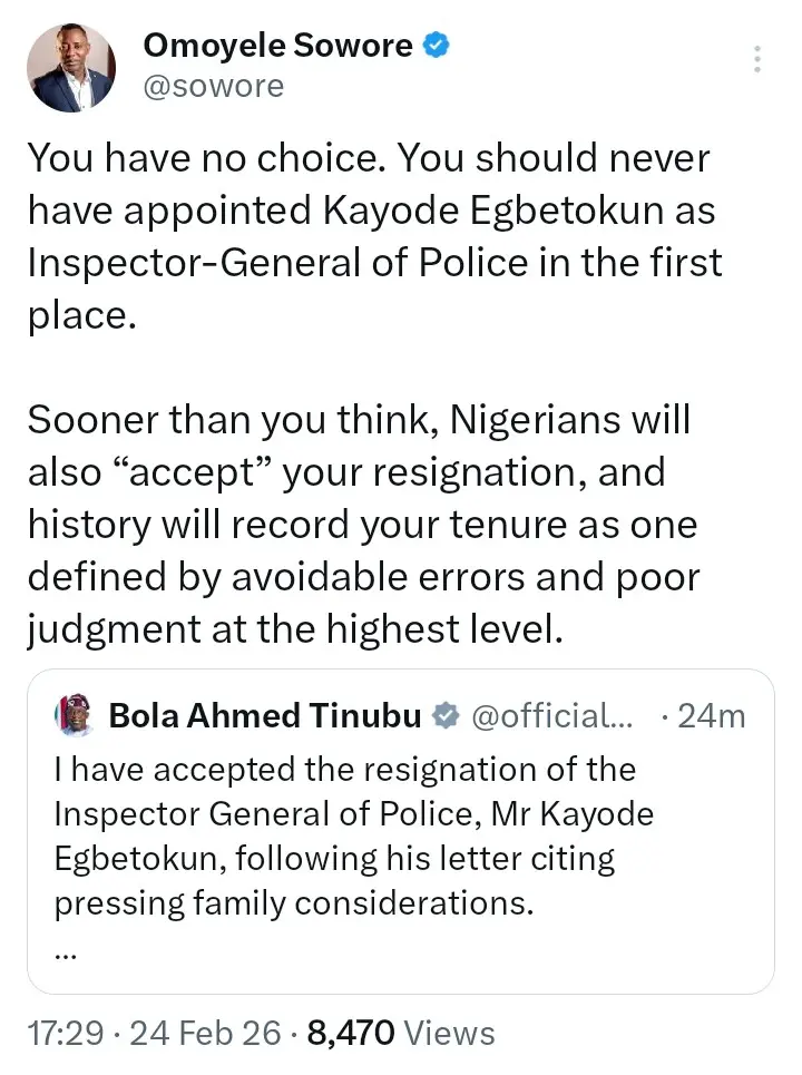 Omoyele Sowore made this statement while reacting to a statement issued by Bola Ahmed Tinubu on his official X account announcing that he had accepted the resignation of Kayode Egbetokun.
