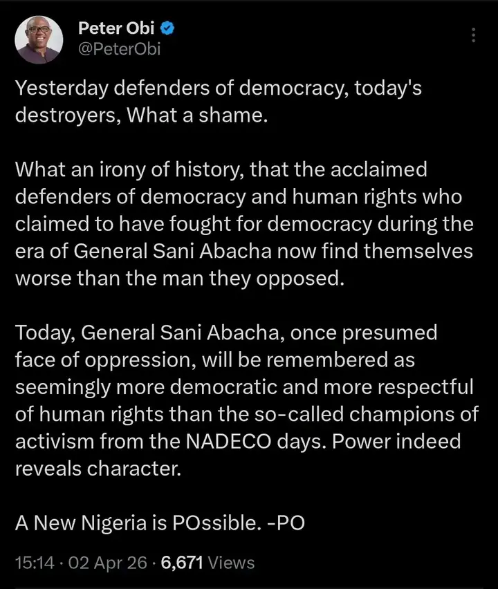 Writing on his official X (formerly Twitter) handle, the Labour Party leader drew a provocative comparison between the current political climate and the military era of General Sani Abacha, suggesting that the champions of activism have proven to be more oppressive than the dictator they once fought.