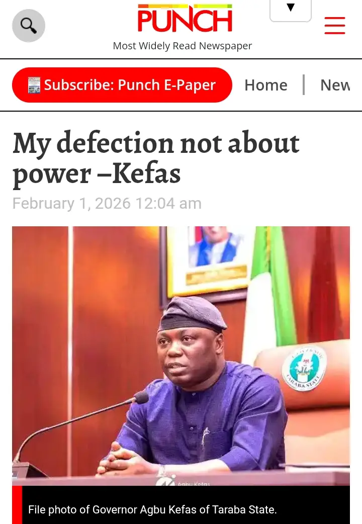 Taraba State Governor Agbu Kefas has said his defection from the PDP to the APC was driven by purpose and the interest of the state, not personal ambition. He described the move as a strategic decision to deepen service delivery and unlock sustainable development for Taraba, insisting he remains committed to the mandate given to him by the people.