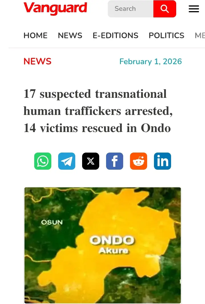 Police arrested 17 suspected transnational human traffickers in Ondo State and rescued 14 victims in two coordinated operations. The suspects were said to have operated as a syndicate involved in illegal cross-border recruitment and exploitation of migrants.