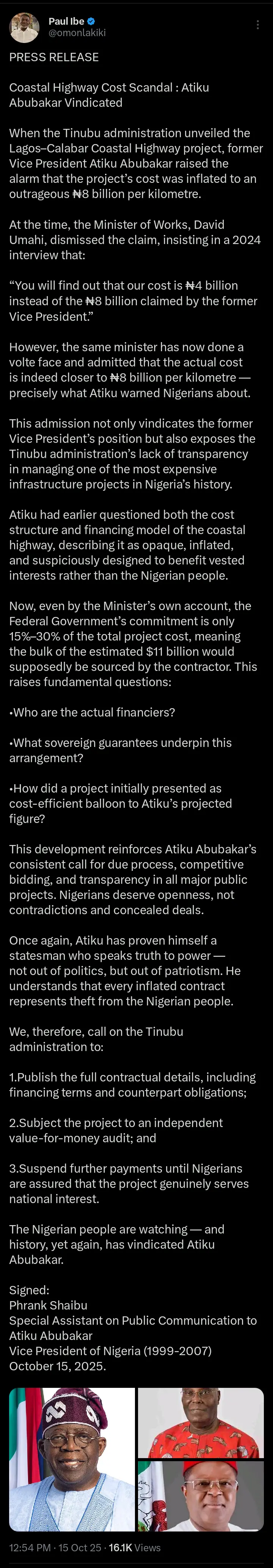 In a recent statement via his official X account, Paul Ibe, the Media Adviser to former Vice President Atiku Abubakar, has stated that his principal has been vindicated over his earlier warnings about the inflated cost of the Lagos-Calabar Coastal Highway project.