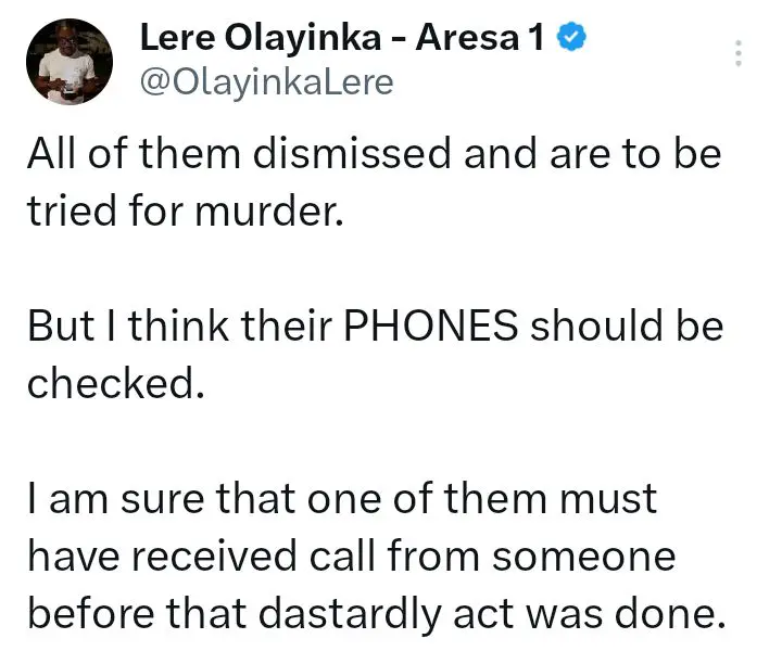 Olayinka further raised suspicions about possible external influence behind the incident, stating, “But I think their phones should be checked.” He added, “I am sure that one of them must have received a call from someone before that dastardly act was done.” His remarks suggest concerns that the fatal shooting may not have been a spontaneous action but rather one influenced by unseen actors.