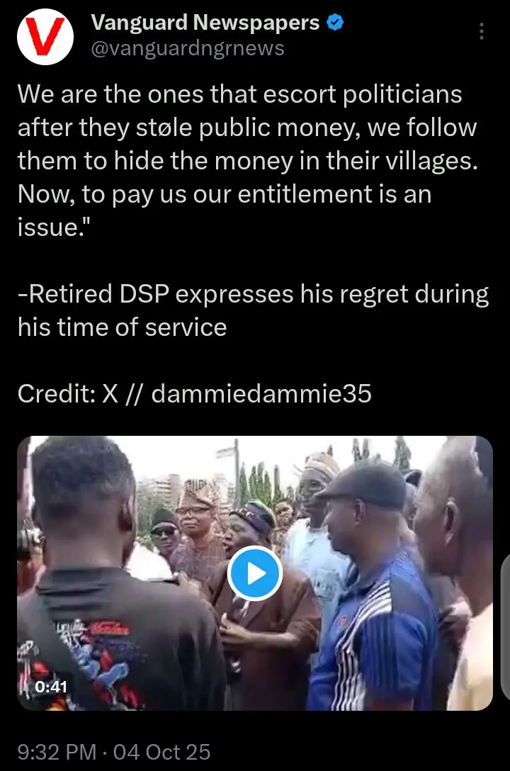 A video shared by VANGUARD newspaper on its official X account on Saturday, October 4, 2025, has sparked significant public outrage after a retired Deputy Superintendent of Police (DSP) made a startling confession about his involvement in escorting politicians to hide stolen public funds.