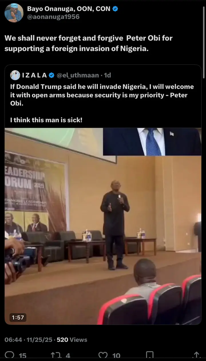 In the post, Onanuga declared: “We shall never forget and forgive Peter Obi for supporting a foreign invasion of Nigeria.” The comment was in response to a video shared by a user who shared a video of Obi saying: “If Donald Trump said he will invade Nigeria, I will welcome it with open arms because security is my priority.” The clip, reportedly filmed during a leadership forum, shows Obi addressing an audience on national security challenges.