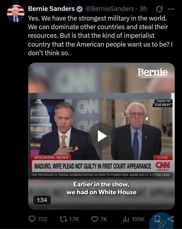 In a statement shared on his verified social media account, the Vermont independent acknowledged the scale of U.S. military dominance but questioned the values guiding its use. “Yes. We have the strongest military in the world. We can dominate other countries and steal their resources,” Sanders wrote. “But is that the kind of imperialist country that the American people want us to be? I don’t think so.”