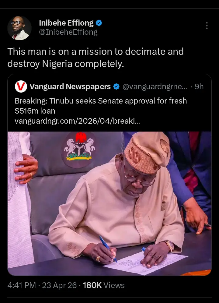 In a recent statement via his official X account, human rights lawyer, Inibehe Effiong, has criticized President Bola Ahmed Tinubu following reports that he is seeking Senate approval for a new $516 million loan.
