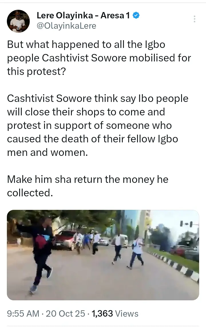 Reacting to the incident via his X account, Olayinka mocked Sowore on social media, questioning the absence of all the Igbo people he claimed to have mobilized for the protest. He sarcastically referred to Sowore as a “Cashtivist,” implying that the activist might have been paid to organize the protest.