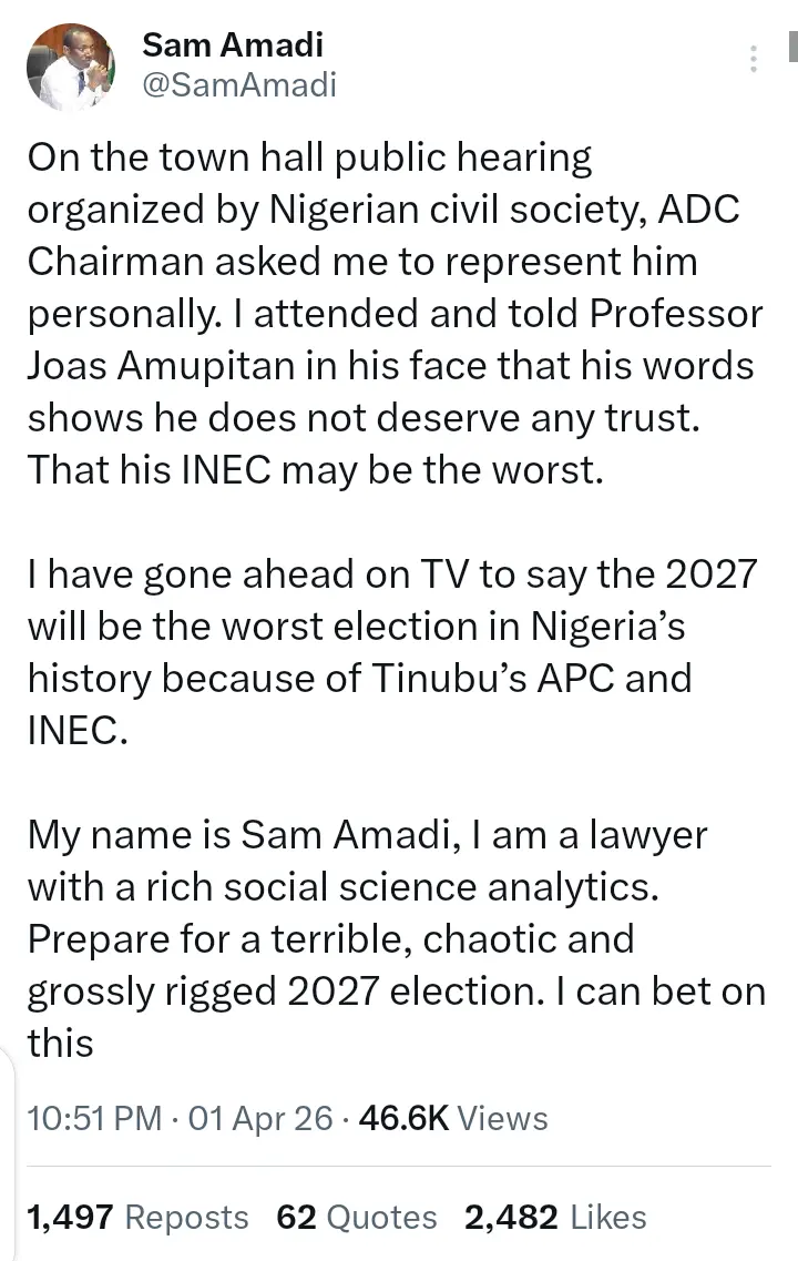 This statement was contained in a post that Sam Amadi shared on his official X handle on April 1, 2026.