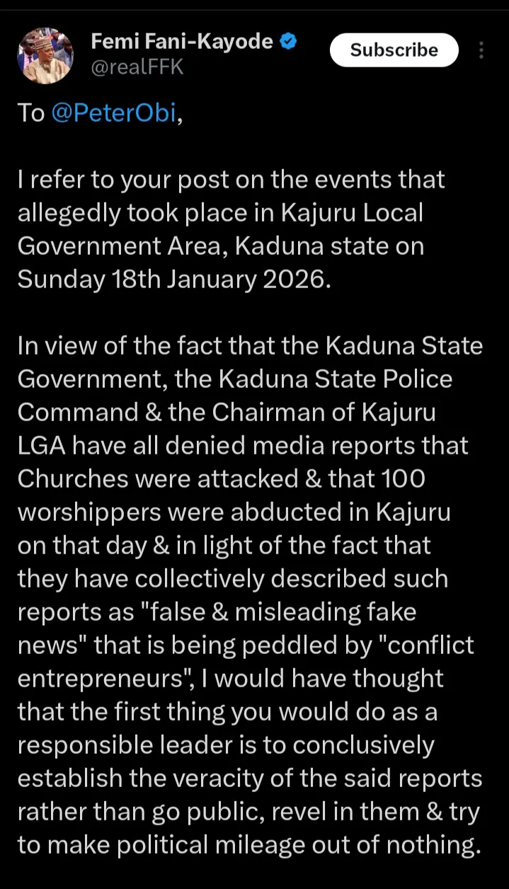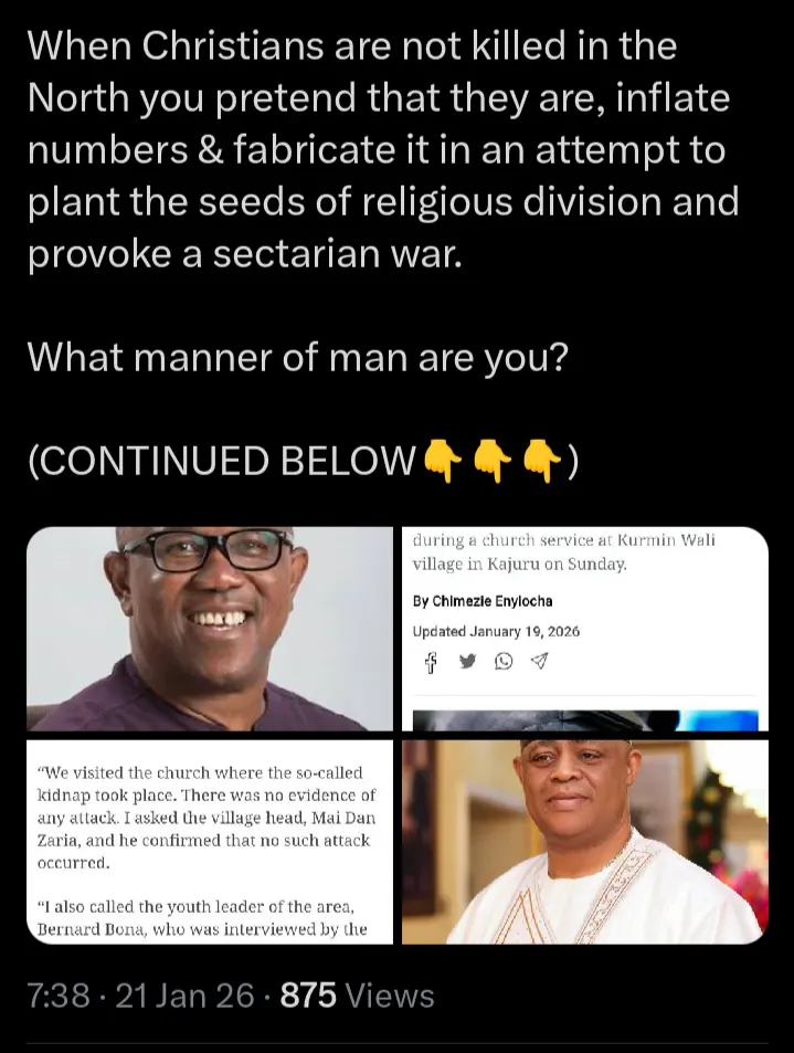 The tension follows Peter Obi’s recent public alarm over the reported abduction of approximately 172 worshippers from churches in Kurmin Wali, Kajuru Local Government Area of Kaduna State on Sunday, January 18, 2026.