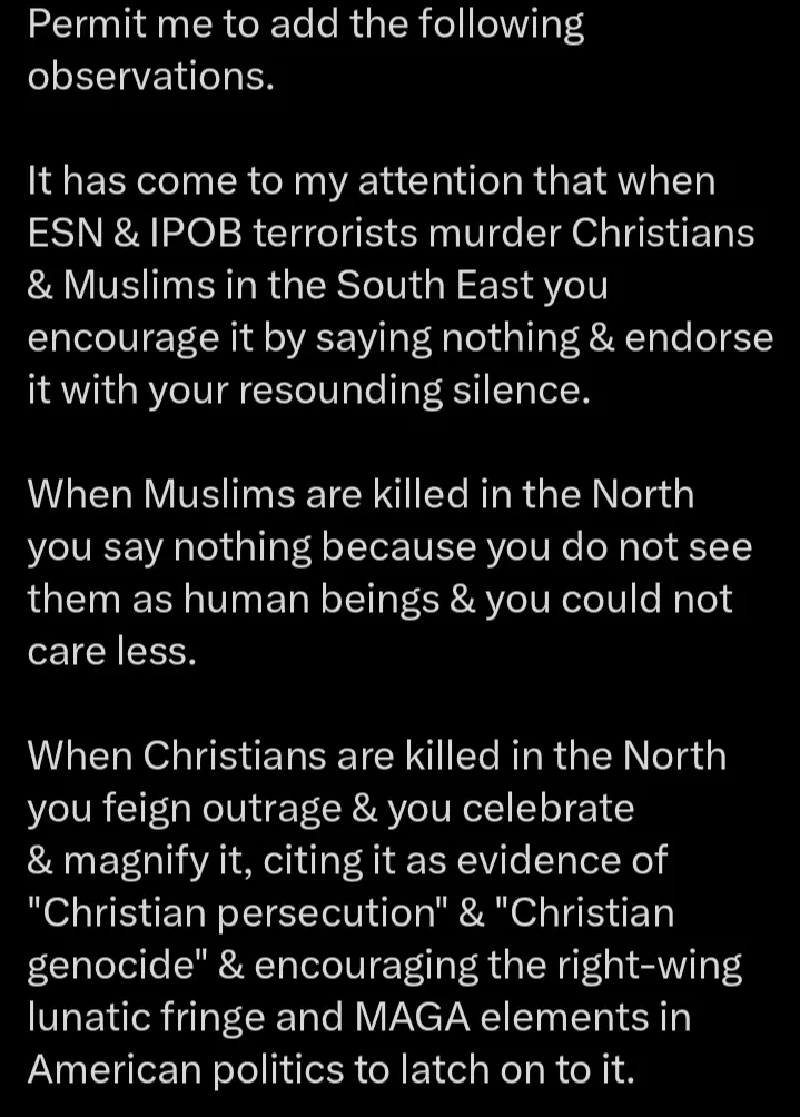 “When Christians are killed in the North you feign outrage & you celebrate & magnify it, citing it as evidence of “Christian persecution” & “Christian genocide” & encouraging the right-wing lunatic fringe and MAGA elements in American politics to latch on to it,” he added.