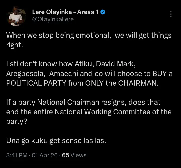 Kindly read what Lere Olayinka wrote on his official X handle below;