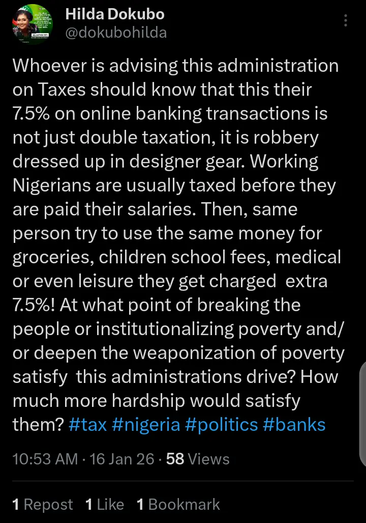 Nigerian politician, Hilda Dokubo has taken her official X account on Friday, January 16, 2026 to react to report of 7.5% deduction on bank transactions.