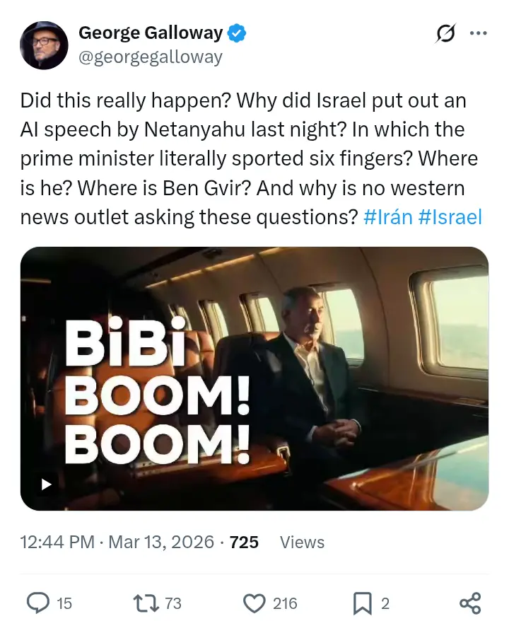 “Did this really happen? Why did Israel put out an AI speech by Netanyahu last night? In which the prime minister literally sported six fingers?” Galloway wrote.