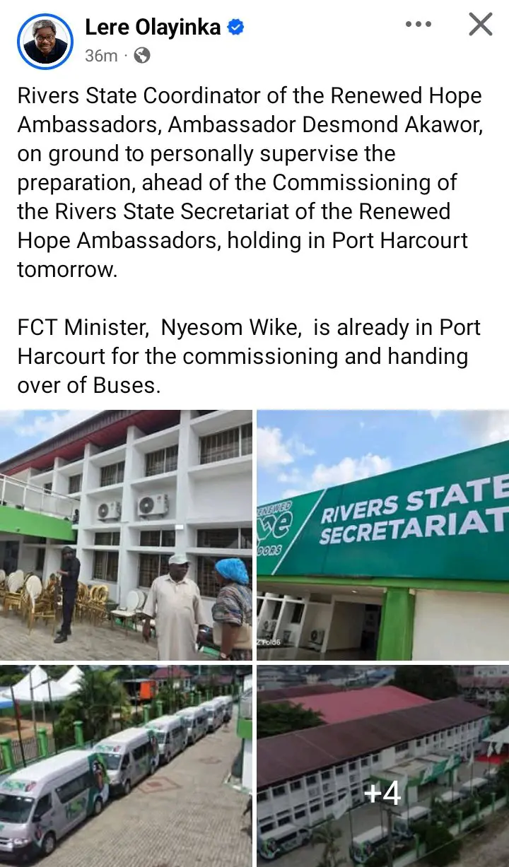 The Rivers State Coordinator of the Renewed Hope Ambassadors, Ambassador Desmond Akawor, was present to oversee the preparations for the opening of the Rivers State Secretariat of the Renewed Hope Ambassadors, which is set to take place in Port Harcourt tomorrow.