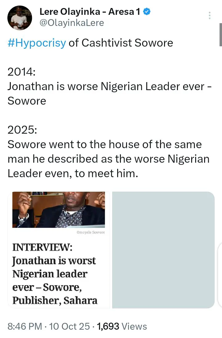 Lere Olayinka, the Senior Special Assistant on Public Communication and Social Media to former Rivers State Governor Nyesom Wike, has reacted to a meeting between activist Omoyele Sowore and former President Goodluck Ebele Jonathan. Taking to his official X handle by Lere Olayinka on Friday, October 10, 2025, Olayinka commented after Sowore announced that he had met Jonathan in Abuja to discuss the continued detention of IPOB leader, Nnamdi Kanu.
