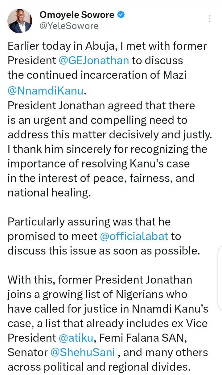 In his post shared by Omoyele Sowore, Sowore said Jonathan agreed that Kanu’s case needed to be addressed urgently and fairly, thanking the former president for acknowledging the importance of justice and national unity. The meeting has since drawn attention across social media, with many expressing mixed reactions.