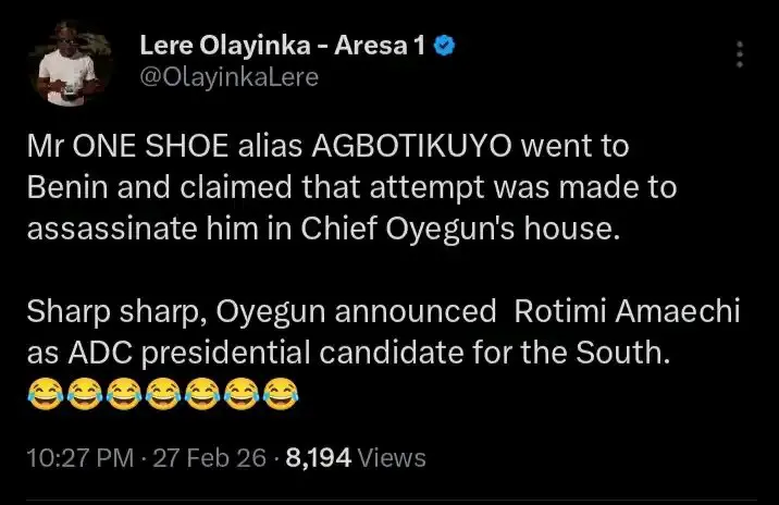 Lere Olayinka, Senior Special Adviser on Media to FCT Minister Nyesom Wike, has reacted on his official X account following comments by former Edo State governor Chief John Odigie-Oyegun regarding the 2027 ADC presidential ticket.