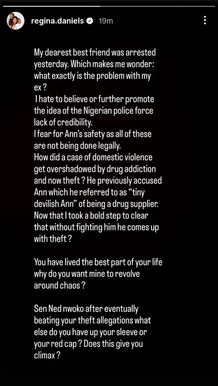 Nollywood actress Regina Daniels has spoken out following the arrest of her close friend, Ann, alleging that the situation is connected to her ongoing dispute with her ex-husband, Senator Ned Nwoko.
