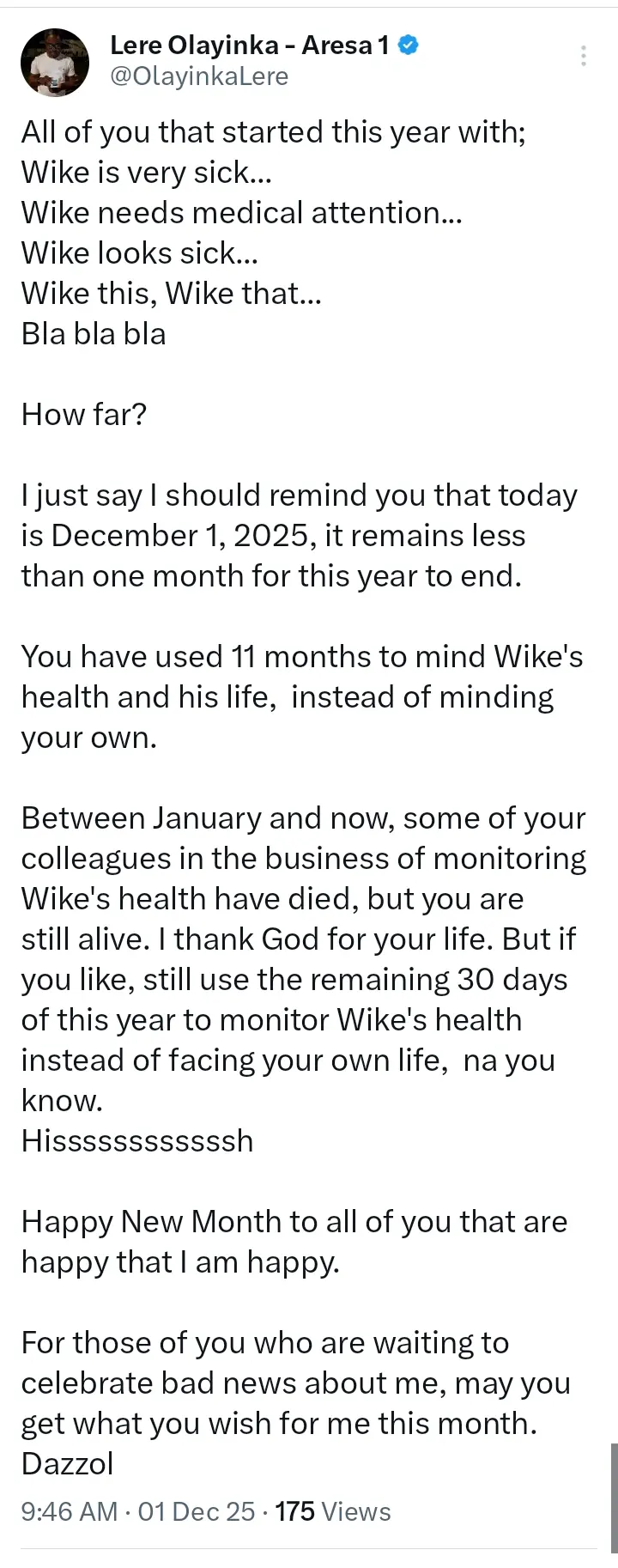 Lere Olayinka, an aide to the Minister of the Federal Capital Territory, Nyesom Wike, has taken a swipe at people who have spent most of the year spreading rumours about the minister’s health. In a message shared on X to welcome the new month, he mocked those who claimed earlier in the year that Wike was seriously ill or needed urgent medical care.