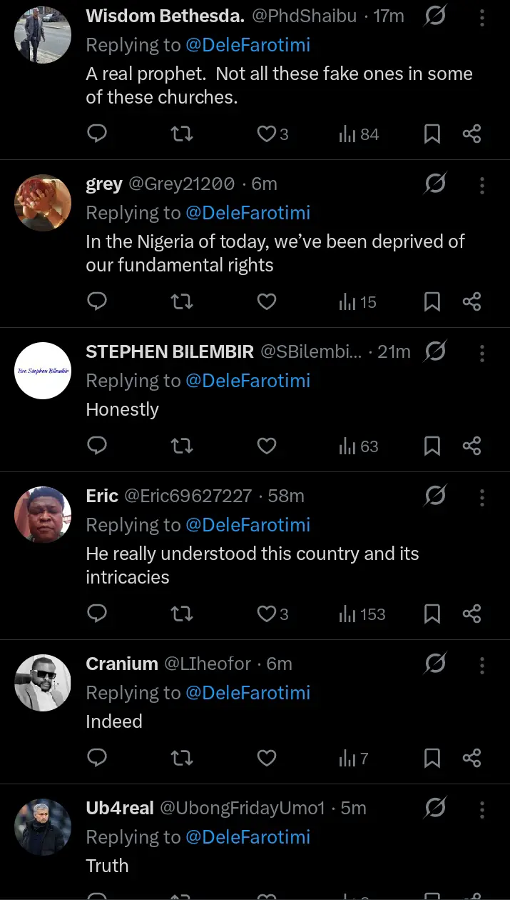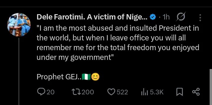 Farotimi’s repost of the quote — captioned simply, “Prophet GEJ” — quickly drew widespread engagement across social media platforms.