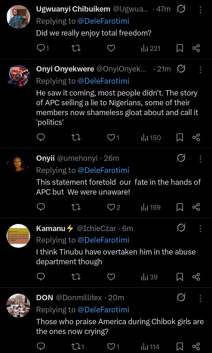 One user reacted, “He saw it coming, most people didn’t. The story of APC selling a lie to Nigerians, some of their members now shamelessly gloat about and call it ‘politics.’”