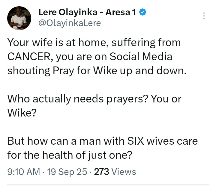 In a post via X, Olayinka’s comment was aimed at drawing attention to what he described as misplaced priorities. He wondered why someone facing such a serious family challenge would rather focus on spreading prayers for Wike, instead of directing that same energy and concern to his wife’s health condition. He also mocked the man for being married to multiple wives yet allegedly showing little care for one who is suffering.
